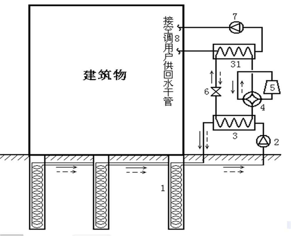 【帶樁基螺旋管地?zé)釗Q熱器的地源熱泵系統(tǒng)示意圖】